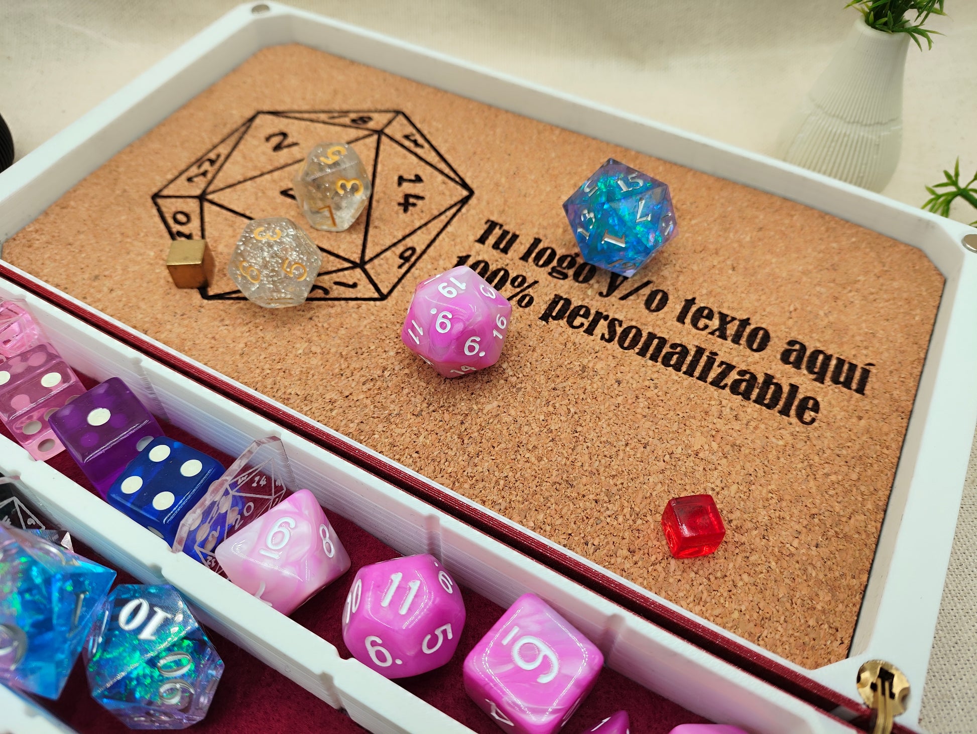 Impresa en 3d en PLA+ de vivos colores y con corcho cortado y grabado a laser para tirar los dados y que amortigüe